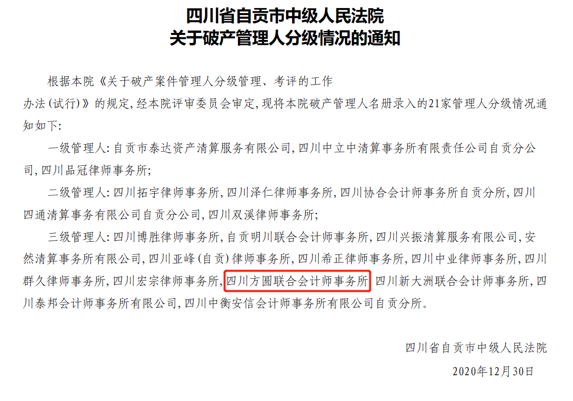 下一篇:方圆会计所代理的“自贡高压阀门股份有限公司破产清算案”入选自贡法院破产审判优化营商环境 十大典型案例(2020-2021)